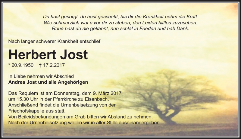 Hier finden Sie alle Traueranzeigen aus der Zeitung, die bisher für Herbert Jost erschienen sind. Weitere Traueranzeigen, die in der Zeitung erscheinen, werden hier ebenfalls aufgelistet