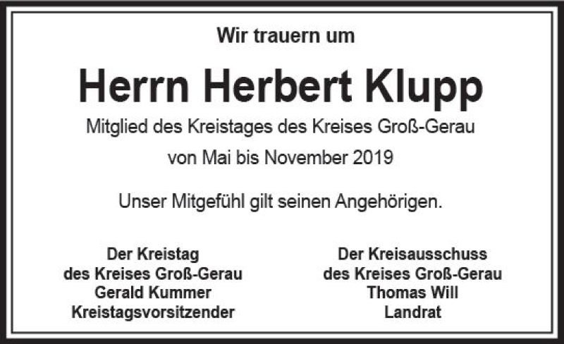 Hier finden Sie alle Traueranzeigen aus der Zeitung, die bisher für Herbert Klupp erschienen sind. Weitere Traueranzeigen, die in der Zeitung erscheinen, werden hier ebenfalls aufgelistet
