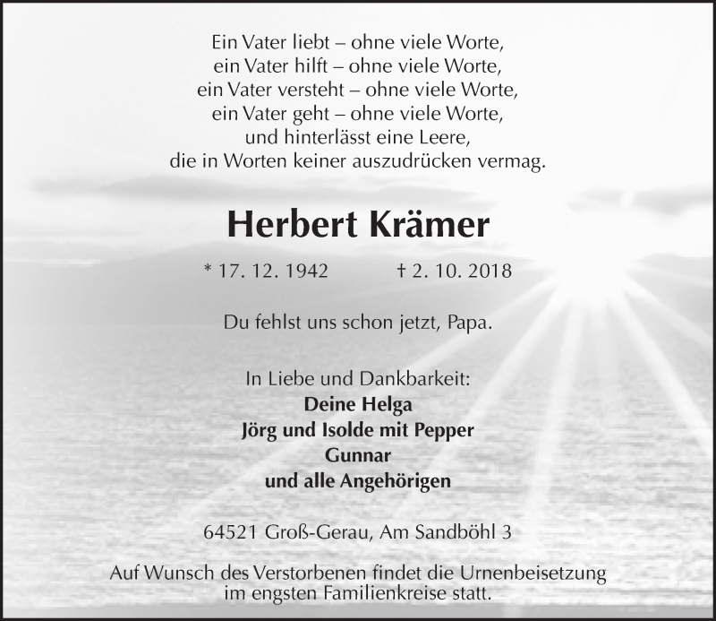 Hier finden Sie alle Traueranzeigen aus der Zeitung, die bisher für Herbert Krämer erschienen sind. Weitere Traueranzeigen, die in der Zeitung erscheinen, werden hier ebenfalls aufgelistet