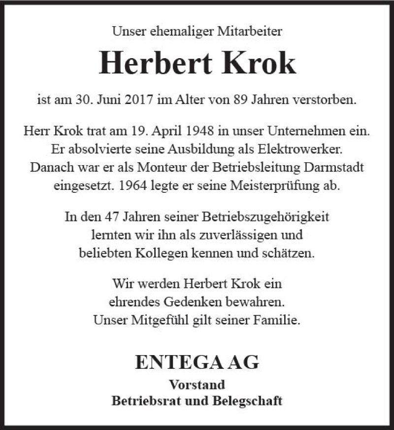 Hier finden Sie alle Traueranzeigen aus der Zeitung, die bisher für Herbert Krok erschienen sind. Weitere Traueranzeigen, die in der Zeitung erscheinen, werden hier ebenfalls aufgelistet