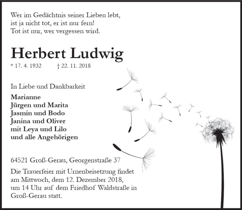 Hier finden Sie alle Traueranzeigen aus der Zeitung, die bisher für Herbert Ludwig erschienen sind. Weitere Traueranzeigen, die in der Zeitung erscheinen, werden hier ebenfalls aufgelistet
