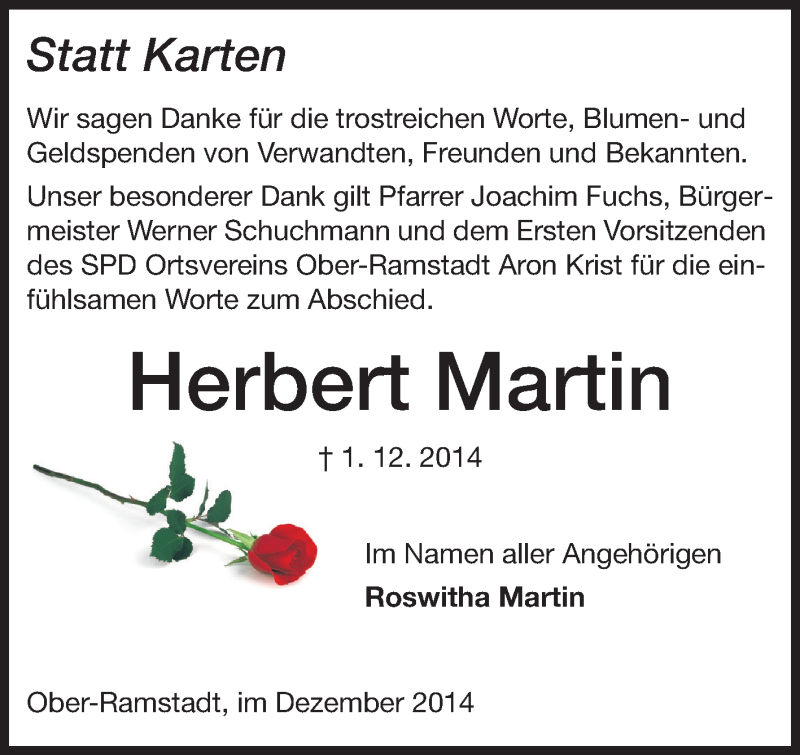 Hier finden Sie alle Traueranzeigen aus der Zeitung, die bisher für Herbert Martin erschienen sind. Weitere Traueranzeigen, die in der Zeitung erscheinen, werden hier ebenfalls aufgelistet