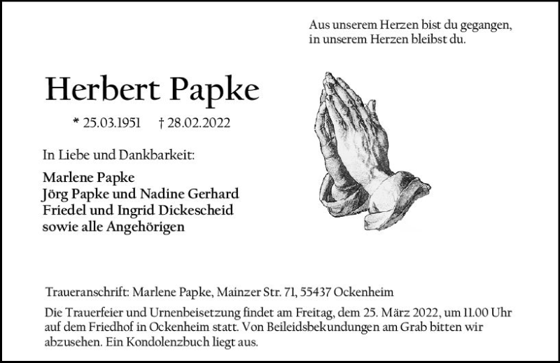 Hier finden Sie alle Traueranzeigen aus der Zeitung, die bisher für Herbert Papke erschienen sind. Weitere Traueranzeigen, die in der Zeitung erscheinen, werden hier ebenfalls aufgelistet