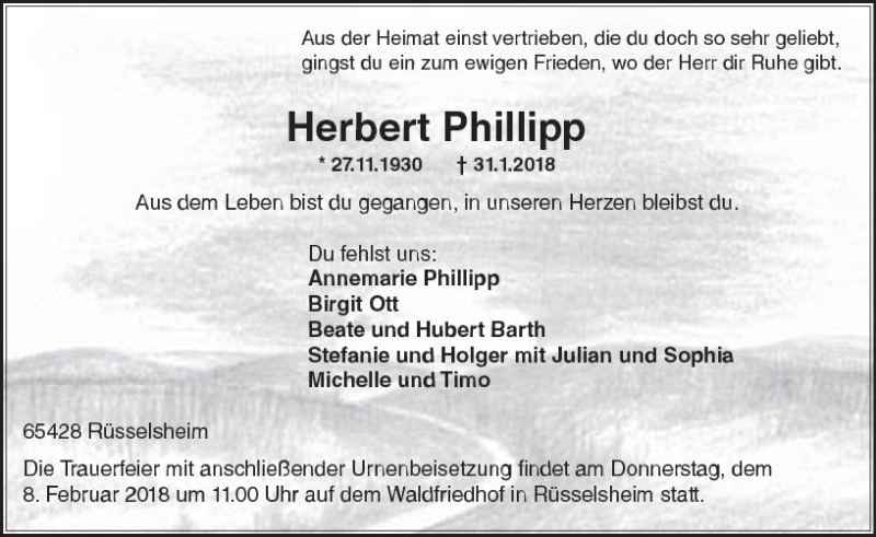 Hier finden Sie alle Traueranzeigen aus der Zeitung, die bisher für Herbert Phillipp erschienen sind. Weitere Traueranzeigen, die in der Zeitung erscheinen, werden hier ebenfalls aufgelistet