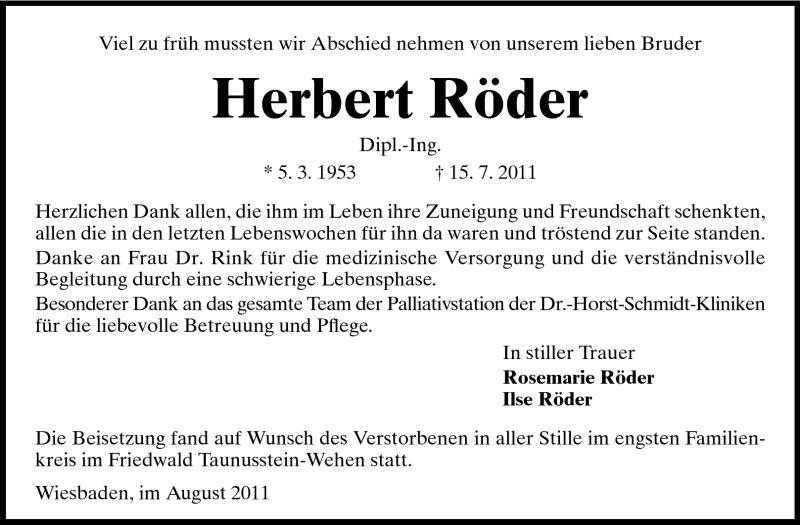 Hier finden Sie alle Traueranzeigen aus der Zeitung, die bisher für Herbert Röder erschienen sind. Weitere Traueranzeigen, die in der Zeitung erscheinen, werden hier ebenfalls aufgelistet