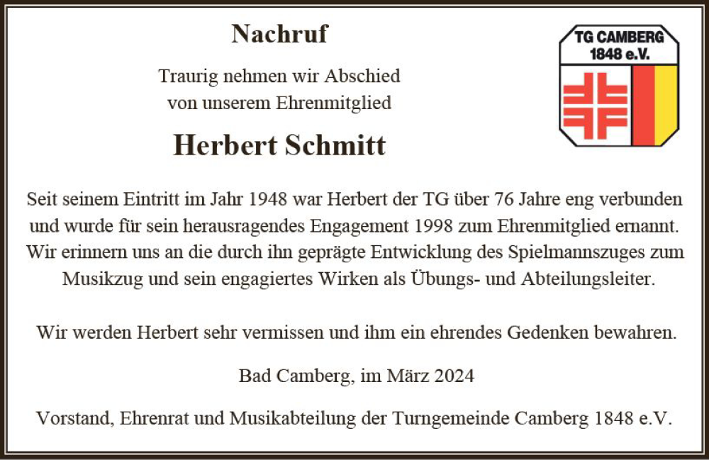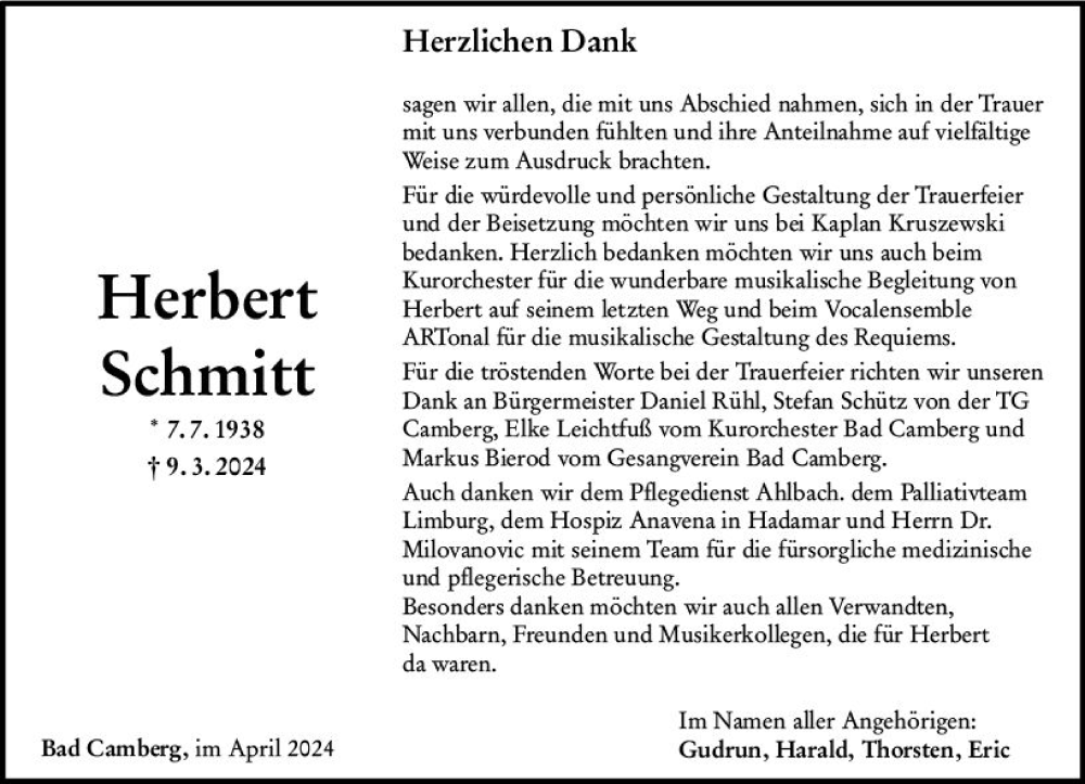 Hier finden Sie alle Traueranzeigen aus der Zeitung, die bisher für Herbert Schmitt erschienen sind. Weitere Traueranzeigen, die in der Zeitung erscheinen, werden hier ebenfalls aufgelistet