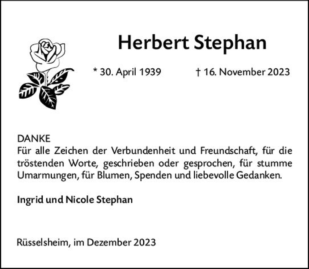 Hier finden Sie alle Traueranzeigen aus der Zeitung, die bisher für Herbert Stephan erschienen sind. Weitere Traueranzeigen, die in der Zeitung erscheinen, werden hier ebenfalls aufgelistet