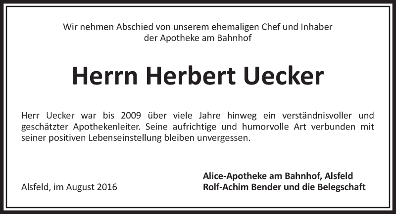 Hier finden Sie alle Traueranzeigen aus der Zeitung, die bisher für Herbert Uecker erschienen sind. Weitere Traueranzeigen, die in der Zeitung erscheinen, werden hier ebenfalls aufgelistet