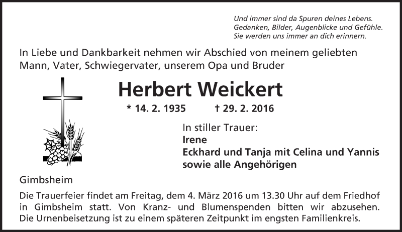 Hier finden Sie alle Traueranzeigen aus der Zeitung, die bisher für Herbert Weickert erschienen sind. Weitere Traueranzeigen, die in der Zeitung erscheinen, werden hier ebenfalls aufgelistet