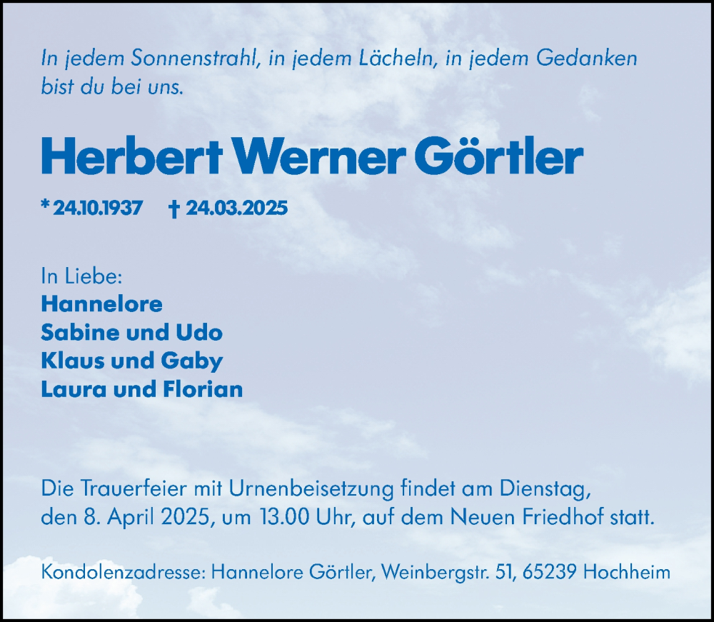Hier finden Sie alle Traueranzeigen aus der Zeitung, die bisher für Herbert Werner Görtler erschienen sind. Weitere Traueranzeigen, die in der Zeitung erscheinen, werden hier ebenfalls aufgelistet