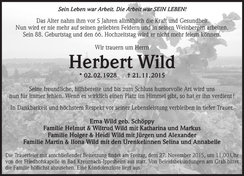 Hier finden Sie alle Traueranzeigen aus der Zeitung, die bisher für Herbert Wild erschienen sind. Weitere Traueranzeigen, die in der Zeitung erscheinen, werden hier ebenfalls aufgelistet