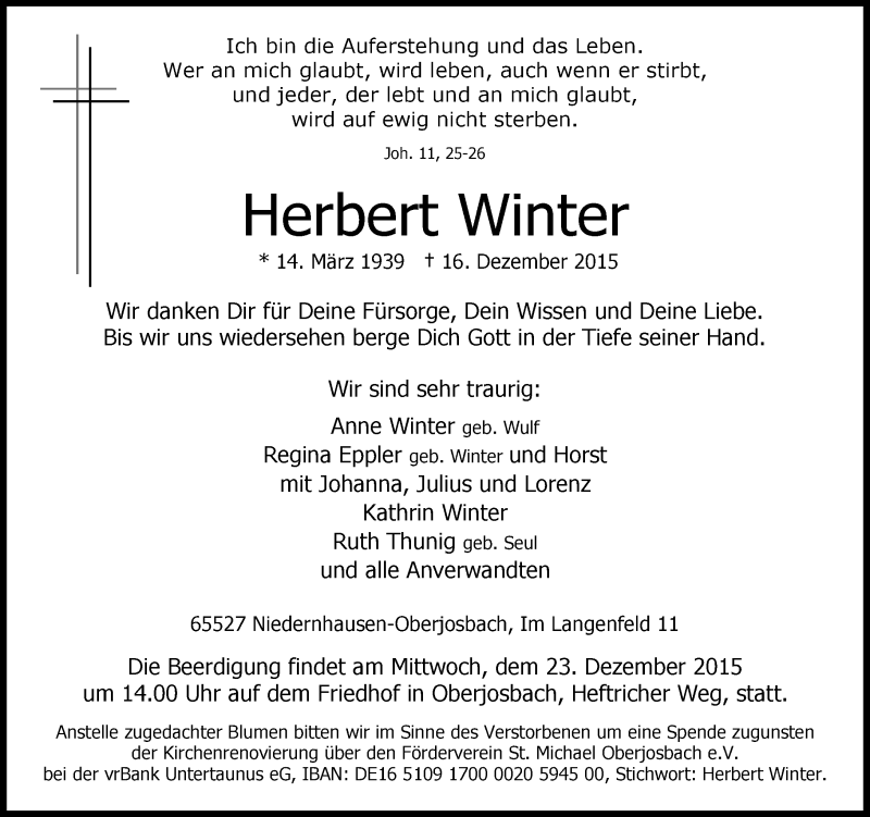 Hier finden Sie alle Traueranzeigen aus der Zeitung, die bisher für Herbert Winter erschienen sind. Weitere Traueranzeigen, die in der Zeitung erscheinen, werden hier ebenfalls aufgelistet