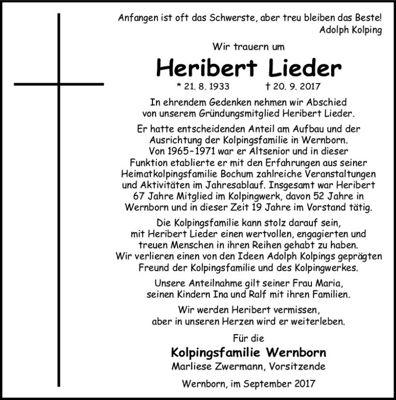 Hier finden Sie alle Traueranzeigen aus der Zeitung, die bisher für Heribert Lieder erschienen sind. Weitere Traueranzeigen, die in der Zeitung erscheinen, werden hier ebenfalls aufgelistet