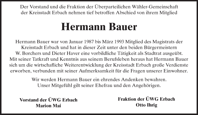 Hier finden Sie alle Traueranzeigen aus der Zeitung, die bisher für Hermann Bauer erschienen sind. Weitere Traueranzeigen, die in der Zeitung erscheinen, werden hier ebenfalls aufgelistet