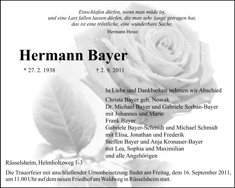 Hier finden Sie alle Traueranzeigen aus der Zeitung, die bisher für Hermann Bayer erschienen sind. Weitere Traueranzeigen, die in der Zeitung erscheinen, werden hier ebenfalls aufgelistet