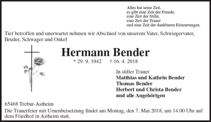 Hier finden Sie alle Traueranzeigen aus der Zeitung, die bisher für Hermann Bender erschienen sind. Weitere Traueranzeigen, die in der Zeitung erscheinen, werden hier ebenfalls aufgelistet