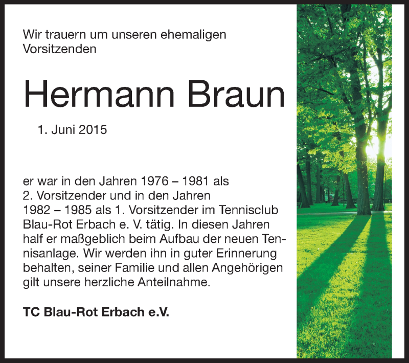 Hier finden Sie alle Traueranzeigen aus der Zeitung, die bisher für Hermann Braun erschienen sind. Weitere Traueranzeigen, die in der Zeitung erscheinen, werden hier ebenfalls aufgelistet