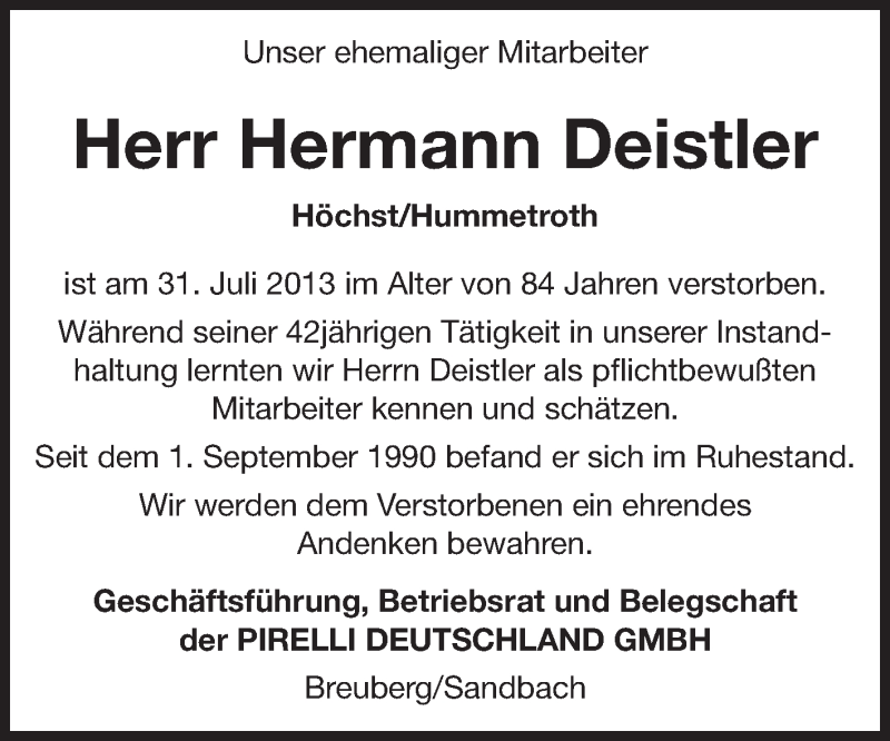 Hier finden Sie alle Traueranzeigen aus der Zeitung, die bisher für Hermann Deistler erschienen sind. Weitere Traueranzeigen, die in der Zeitung erscheinen, werden hier ebenfalls aufgelistet