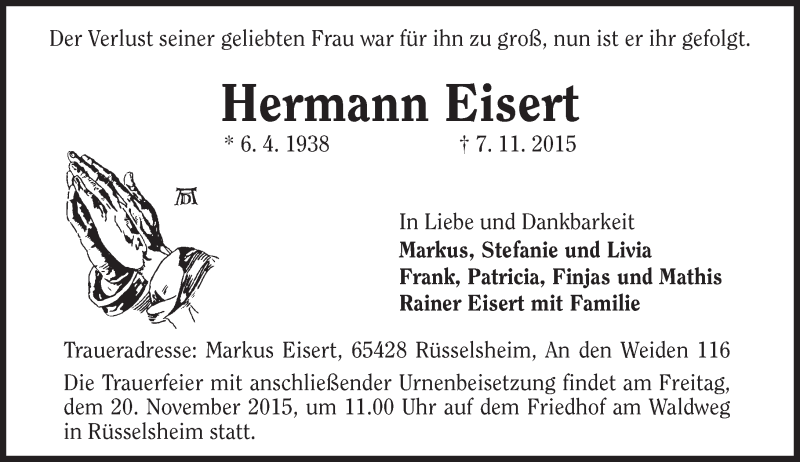 Hier finden Sie alle Traueranzeigen aus der Zeitung, die bisher für Hermann Eisert erschienen sind. Weitere Traueranzeigen, die in der Zeitung erscheinen, werden hier ebenfalls aufgelistet