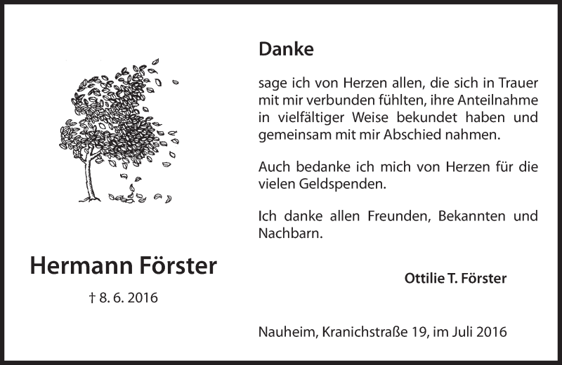 Hier finden Sie alle Traueranzeigen aus der Zeitung, die bisher für Hermann Förster erschienen sind. Weitere Traueranzeigen, die in der Zeitung erscheinen, werden hier ebenfalls aufgelistet