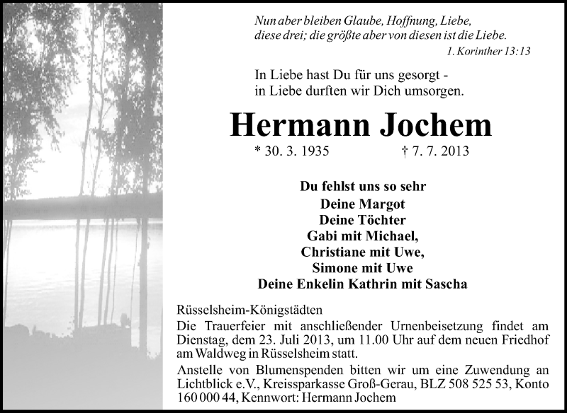 Hier finden Sie alle Traueranzeigen aus der Zeitung, die bisher für Hermann Jochem erschienen sind. Weitere Traueranzeigen, die in der Zeitung erscheinen, werden hier ebenfalls aufgelistet
