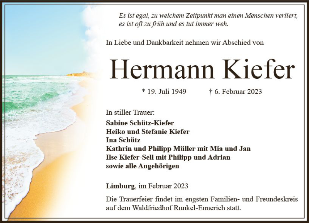 Hier finden Sie alle Traueranzeigen aus der Zeitung, die bisher für Hermann Kiefer erschienen sind. Weitere Traueranzeigen, die in der Zeitung erscheinen, werden hier ebenfalls aufgelistet