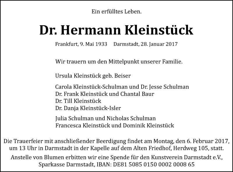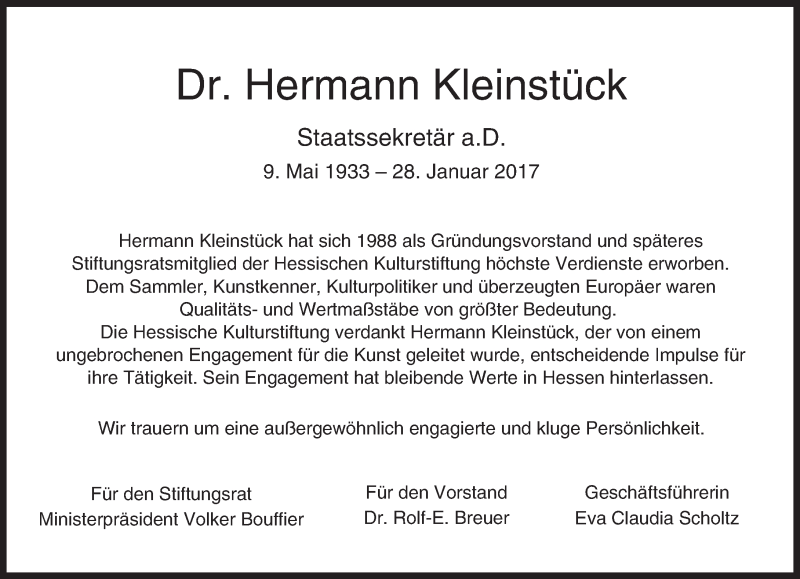 Hier finden Sie alle Traueranzeigen aus der Zeitung, die bisher für Hermann Kleinstück erschienen sind. Weitere Traueranzeigen, die in der Zeitung erscheinen, werden hier ebenfalls aufgelistet