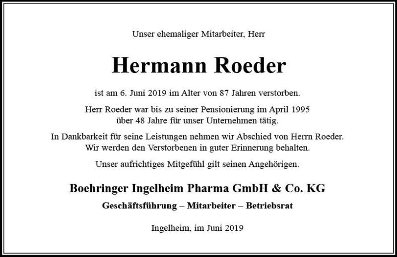 Hier finden Sie alle Traueranzeigen aus der Zeitung, die bisher für Hermann Roeder erschienen sind. Weitere Traueranzeigen, die in der Zeitung erscheinen, werden hier ebenfalls aufgelistet
