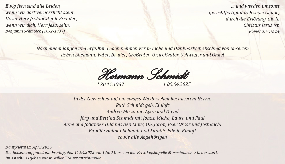 Hier finden Sie alle Traueranzeigen aus der Zeitung, die bisher für Hermann Schmidt erschienen sind. Weitere Traueranzeigen, die in der Zeitung erscheinen, werden hier ebenfalls aufgelistet