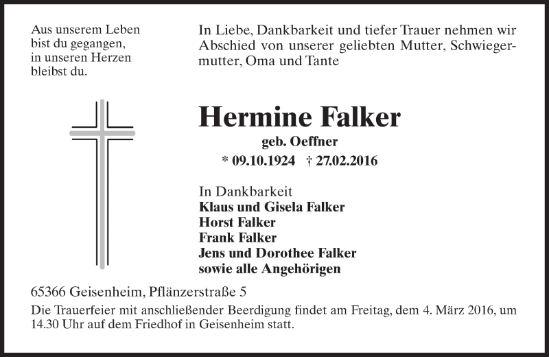 Hier finden Sie alle Traueranzeigen aus der Zeitung, die bisher für Hermine Falker erschienen sind. Weitere Traueranzeigen, die in der Zeitung erscheinen, werden hier ebenfalls aufgelistet