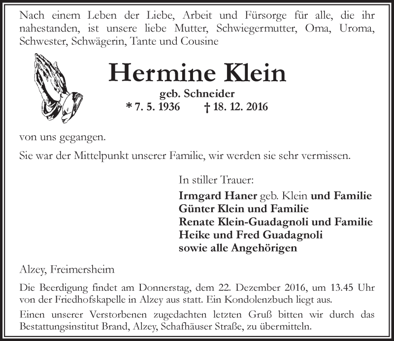 Hier finden Sie alle Traueranzeigen aus der Zeitung, die bisher für Hermine Klein erschienen sind. Weitere Traueranzeigen, die in der Zeitung erscheinen, werden hier ebenfalls aufgelistet