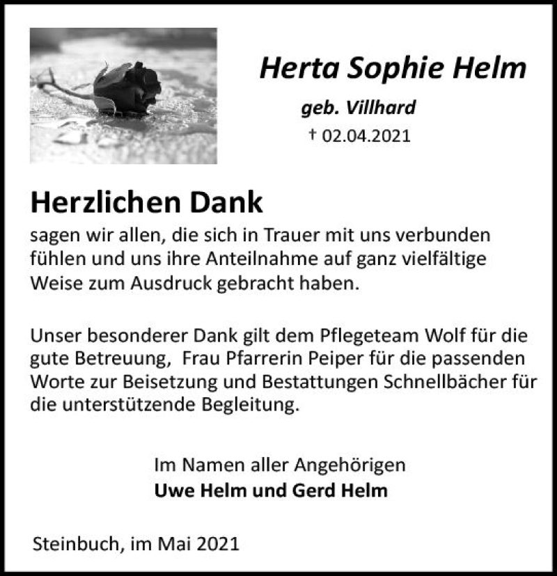 Hier finden Sie alle Traueranzeigen aus der Zeitung, die bisher für Herta Sophie Helm erschienen sind. Weitere Traueranzeigen, die in der Zeitung erscheinen, werden hier ebenfalls aufgelistet