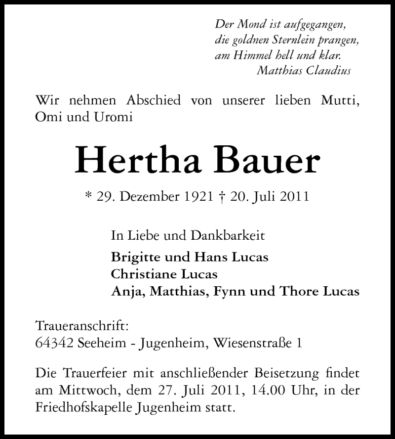 Hier finden Sie alle Traueranzeigen aus der Zeitung, die bisher für Hertha Bauer erschienen sind. Weitere Traueranzeigen, die in der Zeitung erscheinen, werden hier ebenfalls aufgelistet