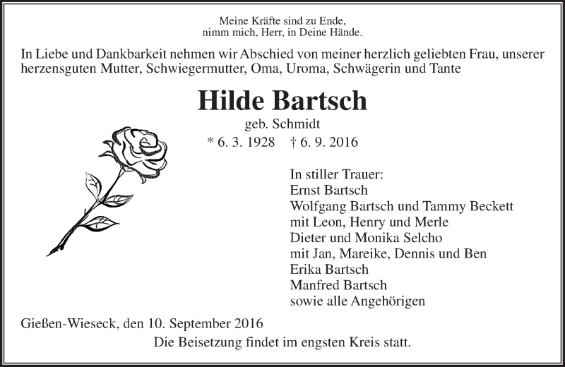 Hier finden Sie alle Traueranzeigen aus der Zeitung, die bisher für Hilde Bartsch erschienen sind. Weitere Traueranzeigen, die in der Zeitung erscheinen, werden hier ebenfalls aufgelistet