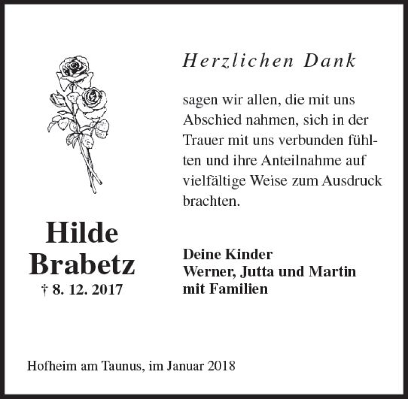Hier finden Sie alle Traueranzeigen aus der Zeitung, die bisher für Hilde Brabetz erschienen sind. Weitere Traueranzeigen, die in der Zeitung erscheinen, werden hier ebenfalls aufgelistet