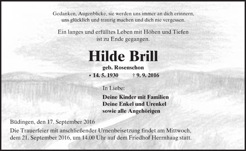 Hier finden Sie alle Traueranzeigen aus der Zeitung, die bisher für Hilde Brill erschienen sind. Weitere Traueranzeigen, die in der Zeitung erscheinen, werden hier ebenfalls aufgelistet