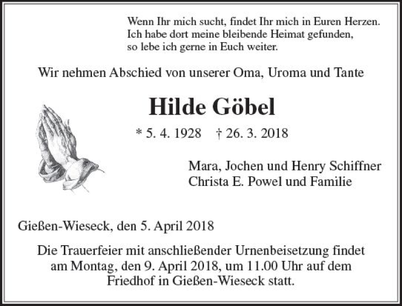 Hier finden Sie alle Traueranzeigen aus der Zeitung, die bisher für Hilde Göbel erschienen sind. Weitere Traueranzeigen, die in der Zeitung erscheinen, werden hier ebenfalls aufgelistet
