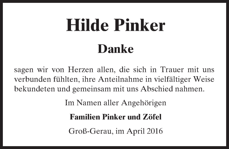 Hier finden Sie alle Traueranzeigen aus der Zeitung, die bisher für Hilde Pinker erschienen sind. Weitere Traueranzeigen, die in der Zeitung erscheinen, werden hier ebenfalls aufgelistet