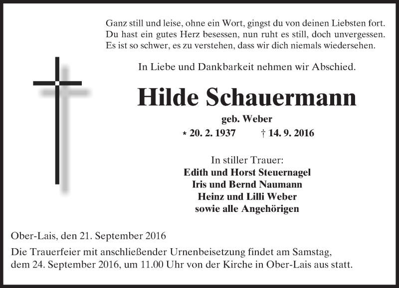 Hier finden Sie alle Traueranzeigen aus der Zeitung, die bisher für Hilde Schauermann erschienen sind. Weitere Traueranzeigen, die in der Zeitung erscheinen, werden hier ebenfalls aufgelistet