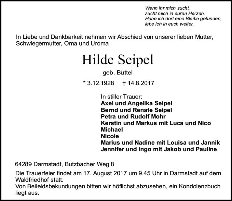 Hier finden Sie alle Traueranzeigen aus der Zeitung, die bisher für Hilde Seipel erschienen sind. Weitere Traueranzeigen, die in der Zeitung erscheinen, werden hier ebenfalls aufgelistet