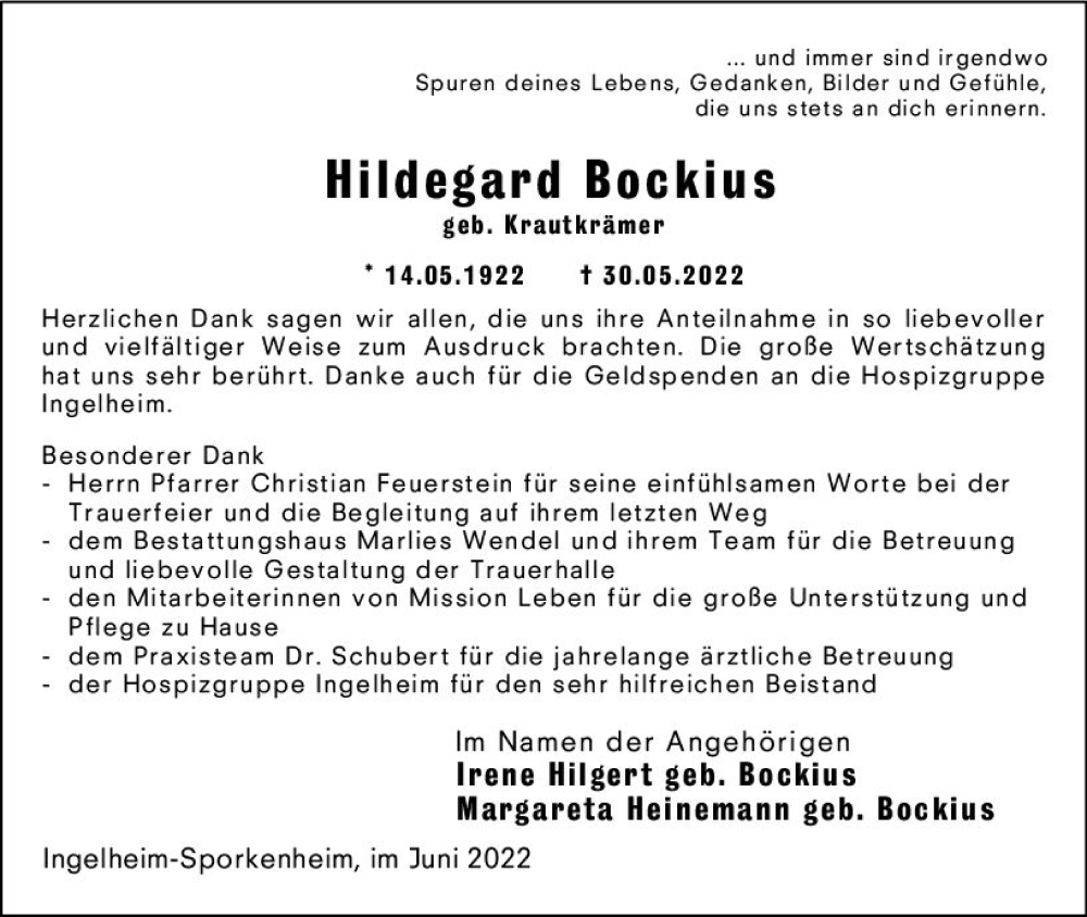Hier finden Sie alle Traueranzeigen aus der Zeitung, die bisher für Hildegard Bockius erschienen sind. Weitere Traueranzeigen, die in der Zeitung erscheinen, werden hier ebenfalls aufgelistet