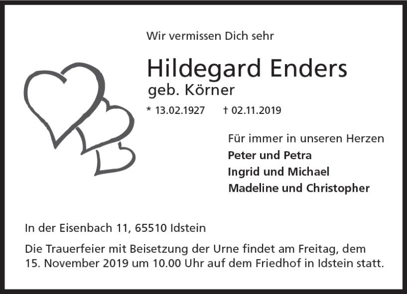 Hier finden Sie alle Traueranzeigen aus der Zeitung, die bisher für Hildegard Enders erschienen sind. Weitere Traueranzeigen, die in der Zeitung erscheinen, werden hier ebenfalls aufgelistet