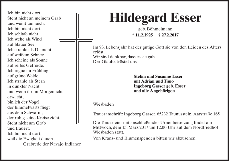 Hier finden Sie alle Traueranzeigen aus der Zeitung, die bisher für Hildegard Esser erschienen sind. Weitere Traueranzeigen, die in der Zeitung erscheinen, werden hier ebenfalls aufgelistet