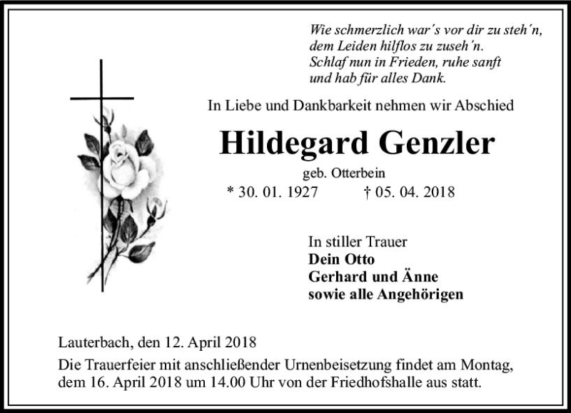 Hier finden Sie alle Traueranzeigen aus der Zeitung, die bisher für Hildegard Genzier erschienen sind. Weitere Traueranzeigen, die in der Zeitung erscheinen, werden hier ebenfalls aufgelistet