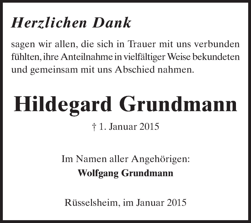 Hier finden Sie alle Traueranzeigen aus der Zeitung, die bisher für Hildegard Grundmann erschienen sind. Weitere Traueranzeigen, die in der Zeitung erscheinen, werden hier ebenfalls aufgelistet
