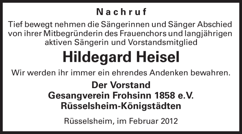 Hier finden Sie alle Traueranzeigen aus der Zeitung, die bisher für Hildegard Heisel erschienen sind. Weitere Traueranzeigen, die in der Zeitung erscheinen, werden hier ebenfalls aufgelistet
