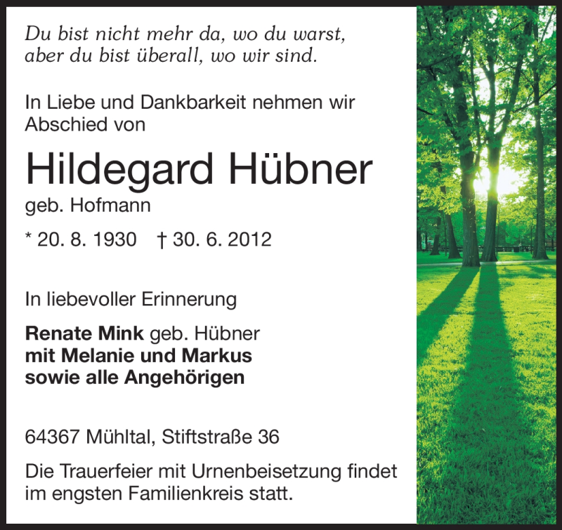 Hier finden Sie alle Traueranzeigen aus der Zeitung, die bisher für Hildegard Hübner erschienen sind. Weitere Traueranzeigen, die in der Zeitung erscheinen, werden hier ebenfalls aufgelistet