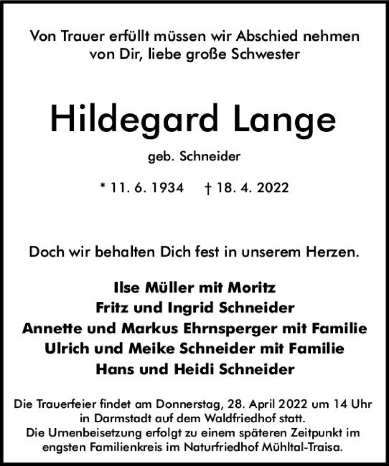 Hier finden Sie alle Traueranzeigen aus der Zeitung, die bisher für Hildegard Lange erschienen sind. Weitere Traueranzeigen, die in der Zeitung erscheinen, werden hier ebenfalls aufgelistet