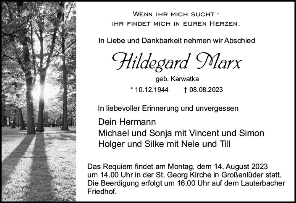 Hier finden Sie alle Traueranzeigen aus der Zeitung, die bisher für Hildegard Marx erschienen sind. Weitere Traueranzeigen, die in der Zeitung erscheinen, werden hier ebenfalls aufgelistet