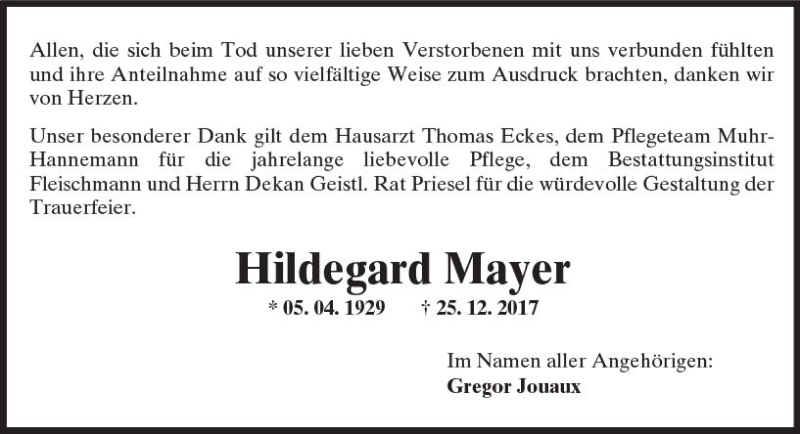 Hier finden Sie alle Traueranzeigen aus der Zeitung, die bisher für Hildegard Mayer erschienen sind. Weitere Traueranzeigen, die in der Zeitung erscheinen, werden hier ebenfalls aufgelistet